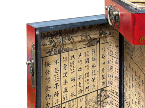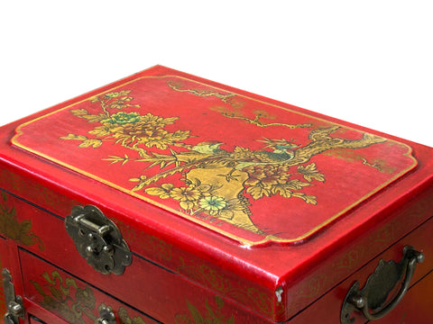 This ornate Chinese-style jewelry chest is a striking example of traditional craftsmanship, featuring a vibrant cinnabar-red finish accented by elegant gold-leaf illustrations. The exterior is meticulously decorated with floral motifs and avian scenes, specifically showcasing a pair of birds perched amidst blooming peonies on the lid, symbolizing prosperity and romance. Functional yet decorative, the chest is equipped with antiqued brass hardware, including a central butterfly-style clasp, ring-pull handles on the four central drawers, and swinging side doors secured by slide bolts.