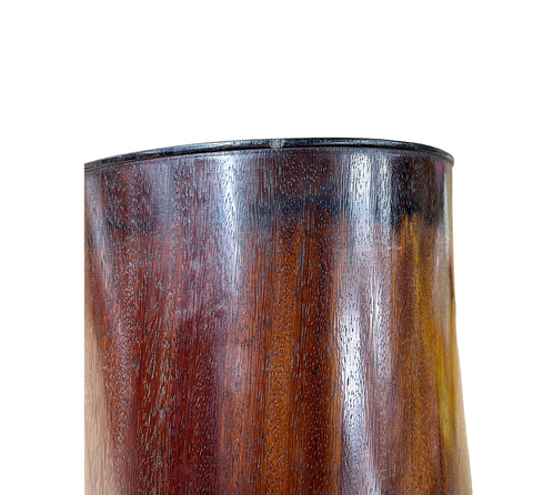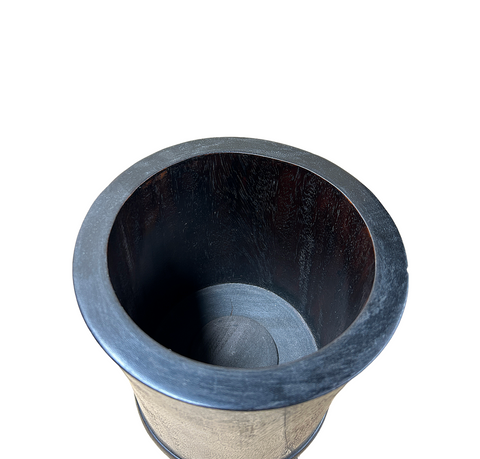 This elegant antique Chinese wood bitong, or brush pot, is a masterpiece of understated scholarly refinement. Carved from a single piece of dense, dark hardwood—likely rosewood that has aged to an almost ebony tone—the cylindrical form rises with gently concave sides, flaring subtly at both the rim and foot to create a poised, hourglass-like silhouette. The surface bears a deep, lustrous patina, richly variegated with streaks of chocolate brown, warm amber, and inky black, and faint hints of crimson that catch the light like liquid garnet. Years of careful handling have burnished the wood to a soft, satin glow, while fine vertical grain lines ripple across the body, lending the piece a quiet vitality. The thick walls are impeccably smooth, the rim and base crisply defined with crisp, rolled edges that speak of meticulous craftsmanship. Standing just tall enough to cradle a collection of writing brushes, it exudes the restrained dignity of a Ming or early Qing scholar’s desk, where function and contemplative beauty coexist in perfect harmony.