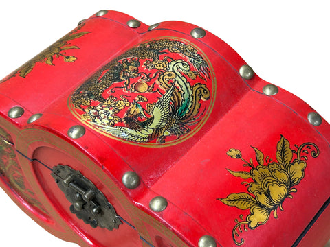 Capture the essence of ancient elegance with this stunning, handcrafted Oriental treasure chest. Finished in a deep, vibrant oriental red, this uniquely contoured box features intricate gold-leaf motifs of the Dragon and Phoenix—timeless symbols of harmony, power, and grace. The exterior is further accented by a traditional key border and rustic brass hardware, offering a perfect blend of regal sophistication and antique charm.