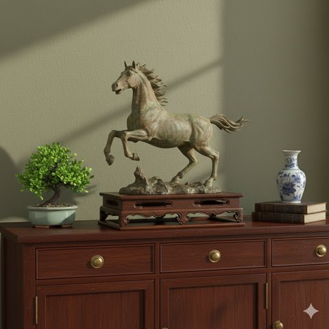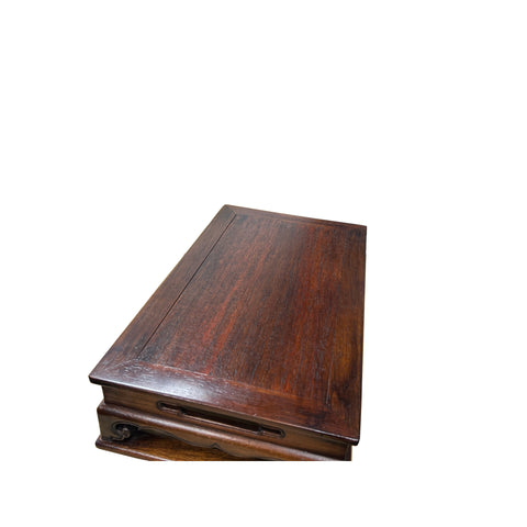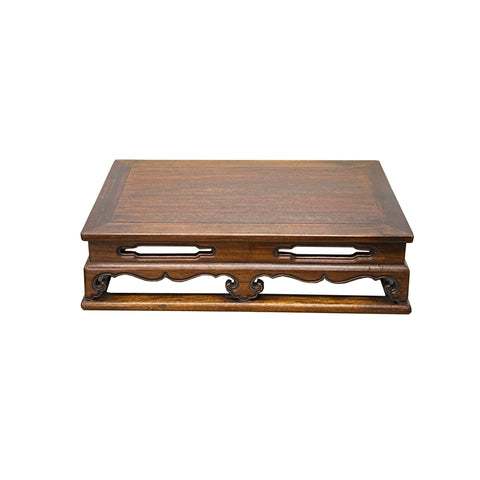 This elegant Oriental-style display stand is crafted from rich, dark-toned wood with a lustrous brown finish that highlights its natural grain. Rectangular in form, the stand features a flat, inset top surface supported by an intricately carved apron. The design is defined by decorative pierced cutouts and scalloped "ruyi" cloud-style motifs along the base, lending an airy yet sophisticated aesthetic to the solid wood construction. Its low-profile architecture is grounded by stylized scroll legs that merge into a continuous floor stretcher, providing both stability and a sense of traditional craftsmanship.