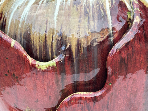 This elegant ceramic fountain features a deep, oxblood-red glazed finish with a contrasting cream and white toned "drip" glaze spilling from the top. Its organic, rounded silhouette is accentuated by a unique, tiered sculptural cutout on the side, designed to guide water in a cascading flow. The top surface is subtly recessed with concentric rings leading to a central plumbing hole, while a circular access port on the back allows for easy internal setup. Solid Base. It can be an accent pot without the pump.
