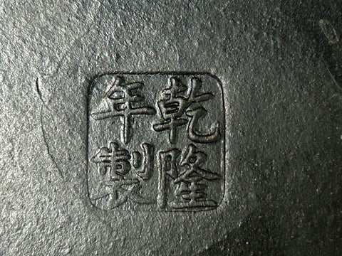 This appears to be a vintage or antique dark-clay teapot, likely of Chinese origin, characterized by its rounded, squat body and rich, textured black surface. The teapot is adorned with vibrant polychrome and gold enamel decorations, featuring two distinct scenes of figures in traditional robes (possibly scholars or officials) set against a backdrop of trees, mountains, and dotted ground cover. The gold detailing is extensively used, particularly on the trees and the stylized patterns covering the lid, creating a striking contrast against the dark clay. The base of the teapot features a square, impressed seal mark with four Chinese characters that read "乾隆年製" (Qiánlóng Nián Zhì), which translates to "Made in the Qianlong Reign" (referencing the 1736–1795 Qing Dynasty period), although such marks are commonly used on later wares as a style tribute rather than an indicator of true period production. The overall aesthetic suggests a piece intended for decorative use, showcasing traditional East Asian artistry. ( Not for tea serving )