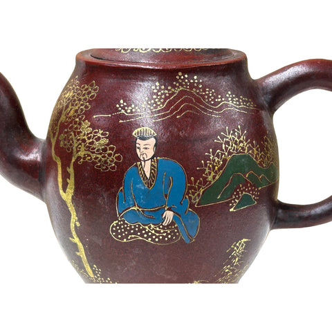This is a charming, somewhat globular earthenware teapot featuring a rich, mottled maroon or reddish-brown body. The surface is beautifully decorated with hand-painted scenes using gilded, gold-colored accents and small touches of blue and green enamel. The central decoration depicts a seated figure, likely a scholar or sage, wearing a blue robe, resting under a stylized gold tree. This figure is set against a background of gently rolling gold-outlined hills and a wash of green enamel on one side, suggesting a pastoral or mountain retreat. The handle is a simple, robust loop, and the spout is short and curved. The lid mirrors the body's decoration with concentric bands of gilded floral or scroll patterns. The style and color palette, particularly the deep red clay and gold accents, suggest it may be a piece of Chinese Yixing clayware or similar Asian pottery, decorated with a traditional figure in a landscape.