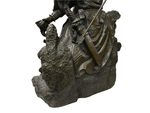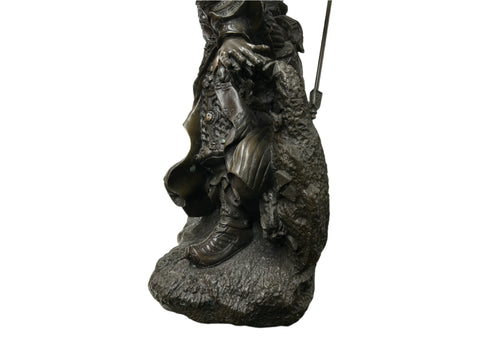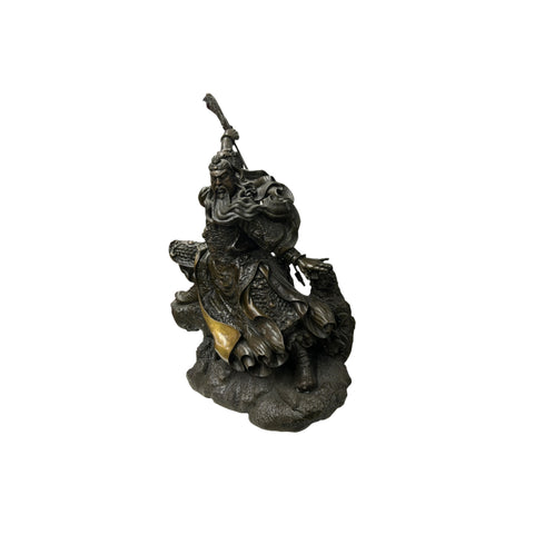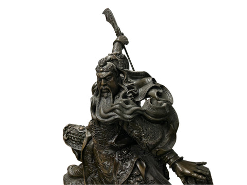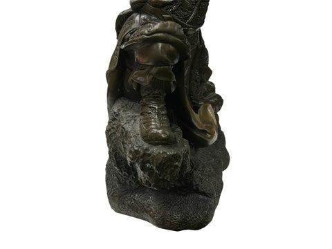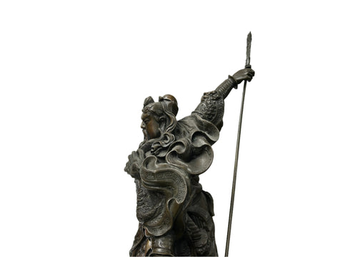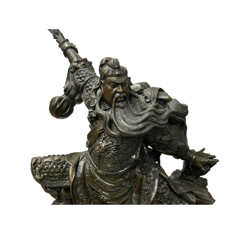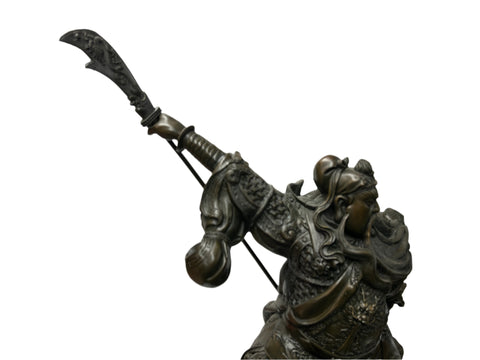 This is a detailed, dynamic bronze statue depicting Guan Yu (also known as Guan Gong), the famous general from the Three Kingdoms period of China, who is revered as a deity of war, wealth, and righteousness. The statue captures the general in a powerful, commanding stance, appearing to be atop a rocky outcrop or battleground. He is clad in meticulously detailed, scaled armor, which features intricate dragon motifs suggesting his high status and martial prowess. In his raised hands, he wields his iconic weapon, the Green Dragon Crescent Blade (or Guan Dao), poised in a striking motion. A touch of contrasting color is provided by a flowing sash or piece of fabric rendered in a lighter, golden bronze, which adds a sense of movement to the otherwise dark, patinated bronze finish. His face bears a fierce, resolute expression, emphasized by his characteristic long, flowing beard, conveying an aura of unwavering bravery and might. ( knife is removable )
