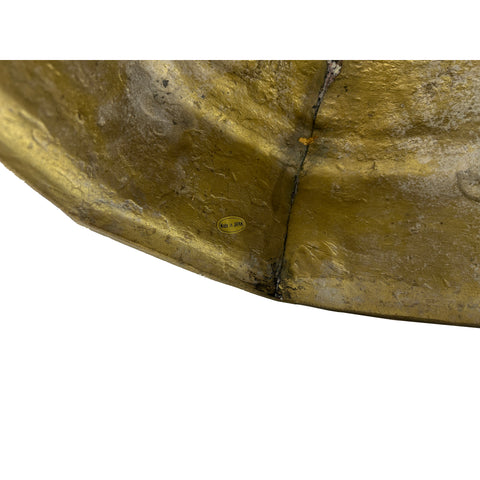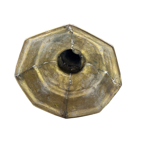 The entire piece sits atop a multi-tiered lotus throne, which rests on a hexagonal base decorated with relief panels. While the statue exudes a timeless, antique gold appearance with a weathered patina, a small "Made in Japan" sticker on the underside and the visible seams in the casting suggest it is a high-quality 20th-century vintage replica or devotional piece rather than an ancient artifact.