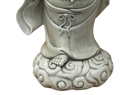 Elevate your space with this exquisite handcrafted statue featuring the revered Laughing Buddha, a symbol of joy, abundance, and prosperity. Meticulously sculpted from high-quality ceramic, this serene figure is adorned with a flowing robe tied with a delicate bow, exuding elegance and tranquility. The Buddha stands gracefully atop a swirling cloud base, holding a Ru Yi scepter in one hand—a traditional emblem of power and good fortune—and a bat in the other, representing happiness and longevity in Eastern culture. The intricate detailing of the beaded necklace draped across his robust form and the gentle curve of his smile invite positive energy into any home or office. Perfect as a thoughtful gift or a centerpiece for meditation spaces, this statue combines spiritual significance with stunning artistry, making it a cherished addition to your collection.