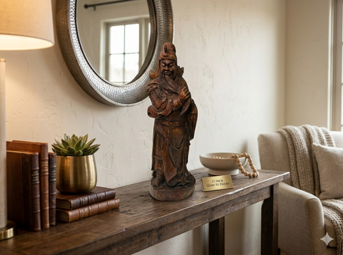 This hand-carved wooden statuette depicts the legendary Chinese general Guan Yu, a figure synonymous with loyalty, righteousness, and martial prowess. Standing in a dignified, authoritative pose, the figure is defined by his iconic "magnificent beard," which he gracefully strokes with one hand—a classic artistic shorthand for his wisdom and composure. He is clad in intricate traditional armor, partially obscured by heavy, flowing robes that showcase the artisan’s skill through deep, rhythmic folds and a polished, dark grain finish.