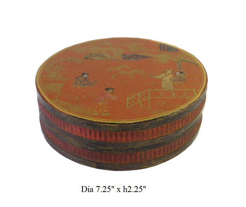 This decorative wooden flat round box is painted with light brown lacquer on the surface and oriental scenery is precisely drawn on the body.
