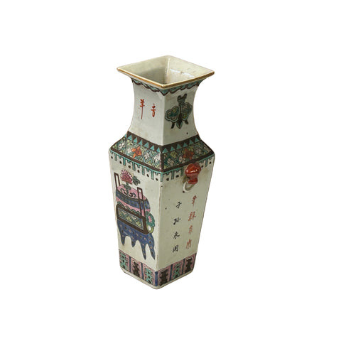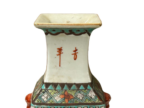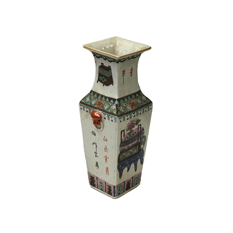 This beautiful, vintage Chinese vase is a unique and captivating piece of art. Its tall, rectangular body is adorned with intricate hand-painted designs in vibrant colors, including a stylized elephant carrying a censer and a floral motif. The vase is further detailed with two striking, red-beaded handles and elegant calligraphy on the sides. A red stamp on the base confirms its authentic origin. This is a perfect statement piece for any collector or home decorator looking to add a touch of timeless elegance and history to their space