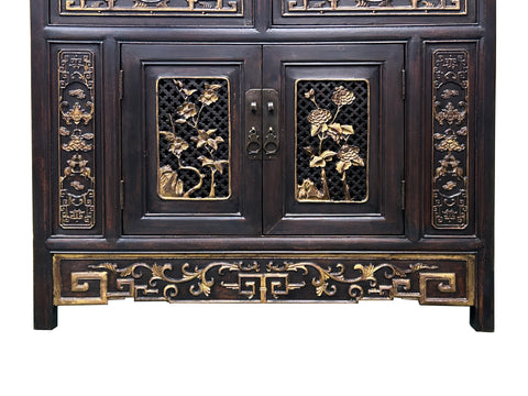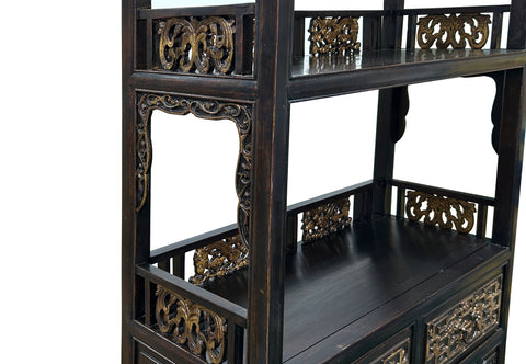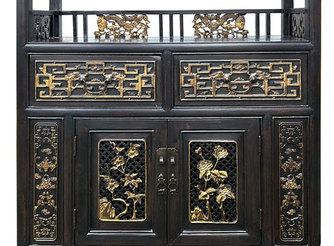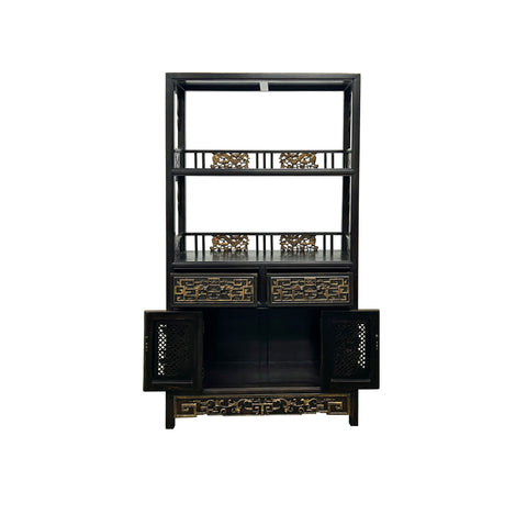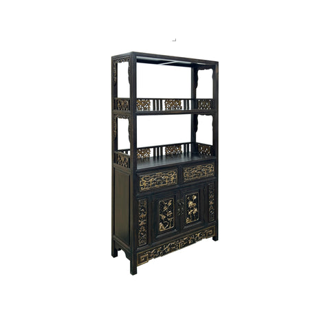 Discover the timeless beauty of this stunning traditional Chinese cabinet, a perfect blend of craftsmanship and elegance. Crafted from rich, dark wood, this piece features intricate gold inlay designs, including floral motifs and geometric patterns, that showcase the artistry of ancient Chinese furniture making. With three open shelves ideal for displaying decor and two spacious drawers paired with double-door storage, this cabinet offers both style and functionality. Its open design and ornate detailing make it a standout addition to any living room, dining area, or office, blending cultural heritage with modern versatility.