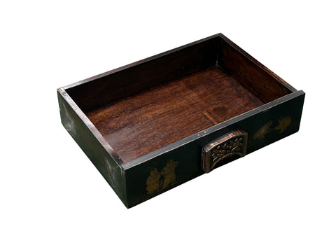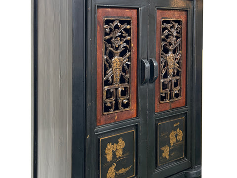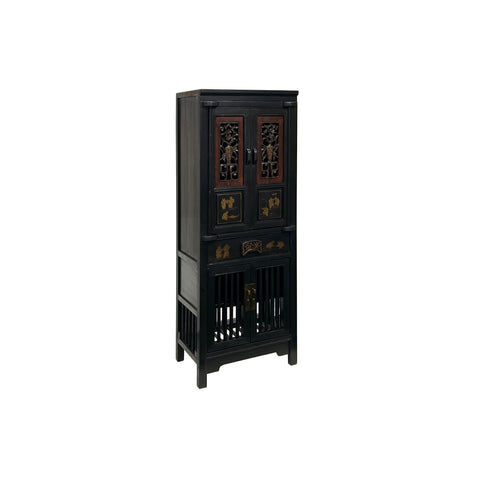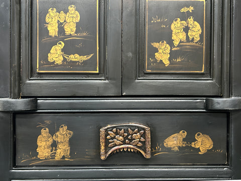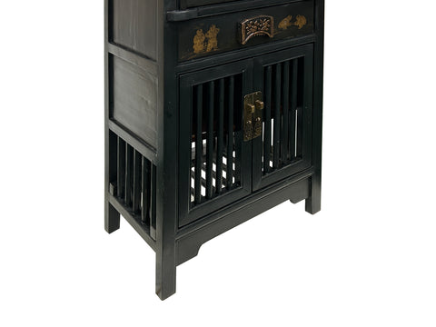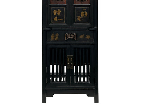 This striking Chinese black lacquer cabinet is a testament to traditional craftsmanship. Handcrafted with intricate details, it features a rich black finish that provides a dramatic contrast to the gilded accents. The upper section boasts two doors with ornate, carved wood panels and a rustic, reddish-brown frame, revealing a spacious interior shelf. Below, a single drawer adorned with charming gold illustrations of children is centered by a unique bronze-finished pull. The lower half of the cabinet is distinguished by two lattice-style doors, creating an airy feel while providing additional storage. Standing on sturdy, tapered legs, this versatile piece blends elegance with functionality, making it a beautiful and practical addition to any living room, dining area, or entryway.