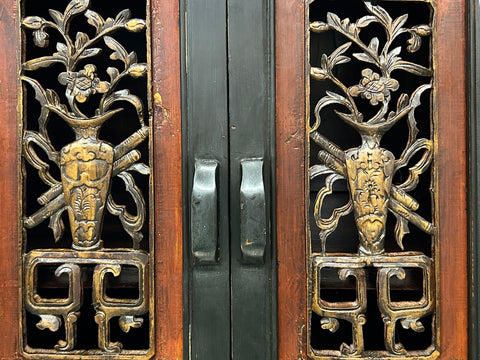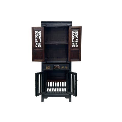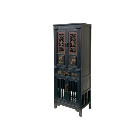 Vintage Chinese Black Opening Vase Flower Carving Slim Storage Cabinet ws4923S