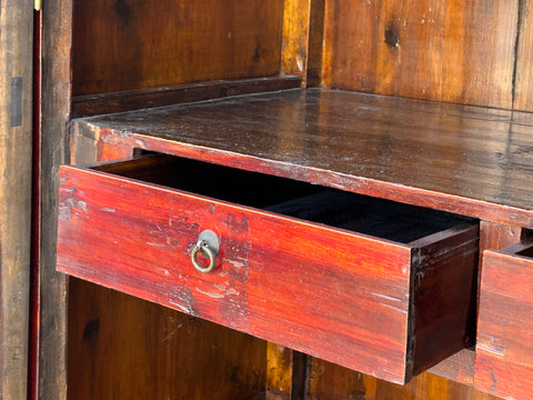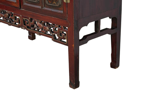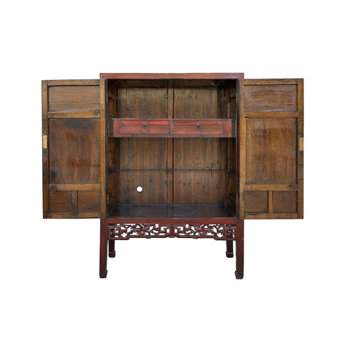 Elevate your space with this stunning antique Chinese cabinet, a testament to timeless craftsmanship and rich cultural heritage. Meticulously handcrafted from dark-hued wood, its ornate doors showcase intricate golden-painted motifs of floral arrangements and traditional vases, reflecting a deep appreciation for nature and artistry. The cabinet stands on a beautifully carved base with open fretwork and detailed floral accents, adding a touch of elegance and lightness to its sturdy form. Inside, the simple, spacious shelving and two drawers offer practical storage, while the aged patina of the wood tells a story of generations past. Perfect as a striking accent piece or a functional storage solution, this cabinet seamlessly blends ancient history with modern decor.