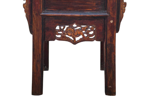This elegant antique Chinese side table, likely from the late Republic period, exudes quiet dignity and refined craftsmanship. Crafted from dense, dark hardwood , its surface bears the deep, lustrous patina earned only through decades of gentle use and careful polishing. The top features the classic "everted flanges" (qiaotou) that curve upward at each end, a hallmark of traditional Chinese furniture that prevents objects from sliding off while adding graceful lines. Pierced and carved spandrels beneath the apron depict swirling clouds and lingering traces of once-gilded dragons, now softened by time into a warm bronze glow. Two drawers with cloud-shaped brass pulls sit above an open lower shelf framed by an intricately fretted apron of bats and stylized shou characters symbolizing longevity and good fortune. Standing on four slightly splayed legs ending in subtle horse-hoof feet, the table balances strength and delicacy, its proportions modest yet commanding, a small altar of domestic beauty that once held incense, tea, or a scholar’s brush pot in a traditional Chinese home.